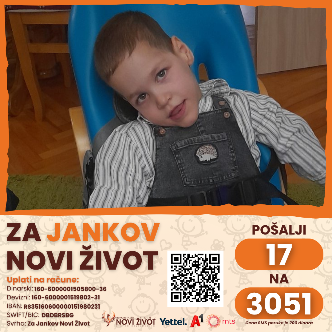 Janko, rođen 2019. godine, na rođenju je ostao bez kiseonika, što je uzrokovalo oštećenje mozga i dobijanje dijagnoze cerebralne paralize. Nažalost, njegova majka je preminula tokom porođaja, a Janko je ostao sa ocem, bolesnom bakom i sestrom Jovanom. Njihova finansijska situacija je veoma teška.